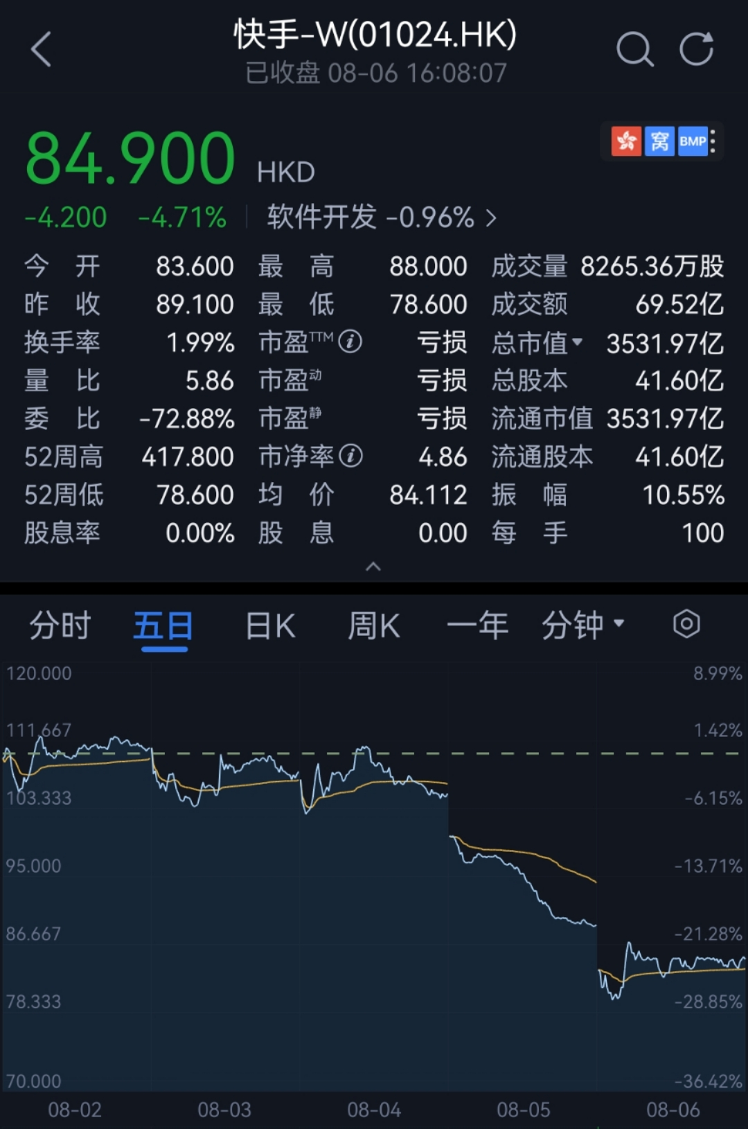 8月6日,快手股价再创新低,下探78.6港元。按照上市之初最高417.8港元计算,目前84.9港元的股价只有其两折左右。